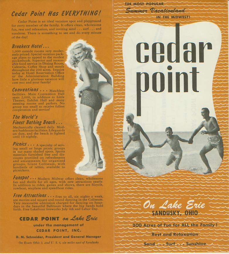 The Following Links will take you to a scaned copy of my 1951-56 Cedar Point Brochure. I'm not sure of this brochures year. It is definatly after 1920 when the Bon-Air wing of Hotel Breakers opened. It is definatly before 1957 when the Cedar Point Causeway opened. I think it is after 1950 when the first road to the Hotel Breakers main entrance opened. The only other thing that may help narrow down the date of the brochure is finding out when D. M. Schneider was President and General Manager. Any help would be appretiated. Enjoy :)