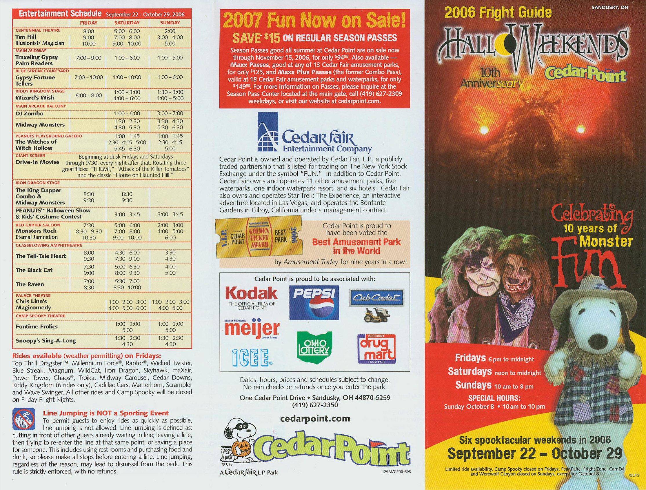 The Following Links will take you to a scaned copy of my 2006 HalloWeekends Cedar Point Brochure & Park Guide. Enjoy :)